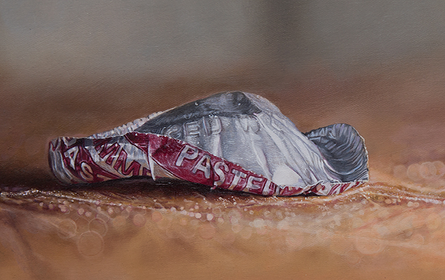 The paintings are of found objects, which are still in situ out in the world after all useful life has been extracted from them.  Their existence, meaning, fascination and purpose, often created by advertising, has been removed.  The objects were the carriers of pleasure and worth but are now just regarded as rubbish.  The paintings reflect what remains when there is nothing left. I see them as metaphors for the human experience, where people are used, consumed and discarded by others. This is reflected in the titles of each painting.