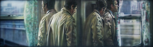 The manipulation of film time and re appropriation of the scene creates a false environment never directed, edited or filmed, offering a second view and narrative directed, edited and painted by the artist. Thus creating another level and world mediated by the artist/director when it is transferred from a film image to a painting.