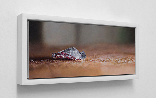 The paintings are of found objects, which are still in situ out in the world after all useful life has been extracted from them. Their existence, meaning, fascination and purpose, often created by advertising, has been removed. The objects were the carriers of pleasure and worth but are now just regarded as rubbish. The paintings reflect what remains when there is nothing left. I see them as metaphors for the human experience, where people are used, consumed and discarded by others. This is reflected in the titles of each painting. These paintings are heavily influenced by my interest in the photographic/cinematic image where twenty-four frames per second flash past our eyes. We consume thousands of images on social media, television and film everyday. My attempt is to step back from this bombardment of images, to give myself and the viewer the opportunity of actually appreciating what we are seeing. I feel that the detail in the work helps the viewer to do this due to the creativity and work involved in its creation. Having seen so many similar images in films, television and adverts, where a close up shot of an object is used to tell a story, sell a product or used as a devise for embellishing a narrative, I have used the exact wide screen cinematic proportions for the paintings of 2.39:1 to hopefully invite the viewer to create their own narrative around the works. As they look like film stills, it offers the idea of something happening before and after, the objects being used as props, being there for a reason and are not just rubbish that somebody has used and discarded. I would like the paintings to be viewed as one frame in a sequence of twenty-four per second. The fleeting frame frozen so the viewer can consider the process of construction, the surface, the tones, the details, overall composition, idea and intention. I feel that this can only be achieved with paint where the viewer can look at the painted picture on another level and plane other than a transient photographic or cinematic one. |